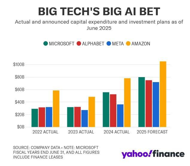 近年来,亚麻的资本支出一直高于其它科技公司,其主要原因是 Amazon 人工智能上下都是血本无归。最新估计,亚麻将投入约 1050 亿美元推动人工智能的发展,仍然远高于同行。