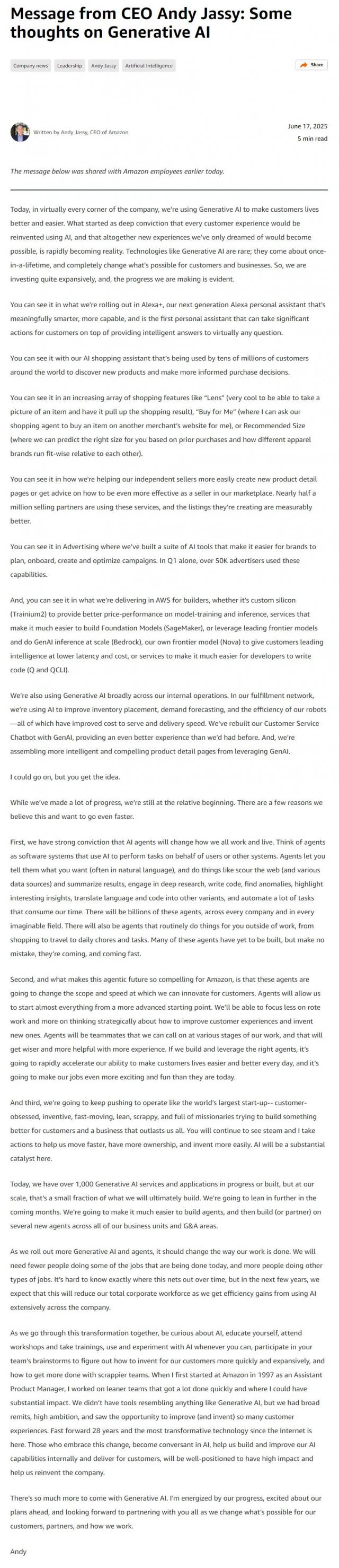 亚马逊CEO Andy Jassy 6 月 17 日本公告表示,预计未来几年公司员工数量将减少。,因为企业更依赖生成的人工智能工具来帮助履行职责。Andy Jassy 公告原文如下: