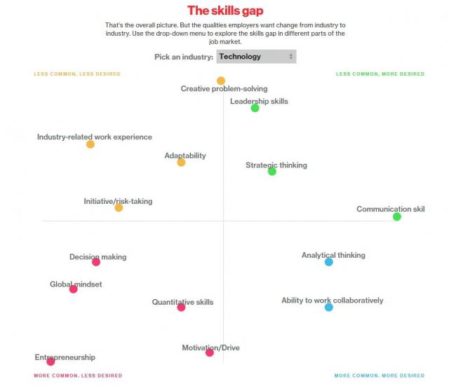 下方是 Bloomberg 技术领域流行的软技能列出来了。很多名校毕业生直到毕业才意识到自己在学校学到的东西并不能完全满足职场的需求,导致学术水平和行业预期差距巨大。