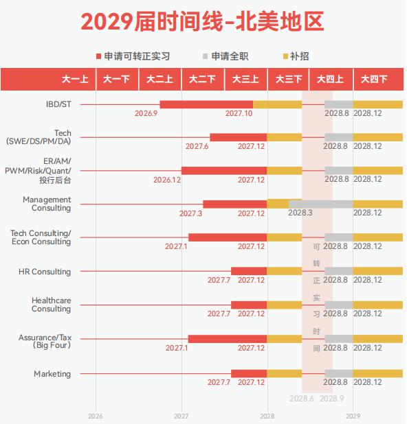 以下是 WST 最新整理的 2029 今年北美各行业业主申请季的时间窗口, Tech 大二下学期,行业将开始申请大三暑期实习,供大家参考: