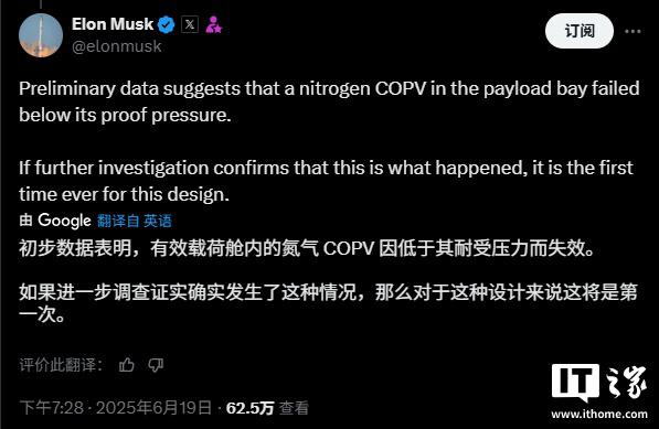 事件发生后不久,马斯克就分享了一些信息。回复太空爱好者 @Erdayastronaut 马斯克在帖子中说:“初步数据显示,N2在负载舱内。 COPV “如果进一步调查证实了这一点,这将是这种设计中第一次出现这种情况,因为它的验证压力下出现了故障。”