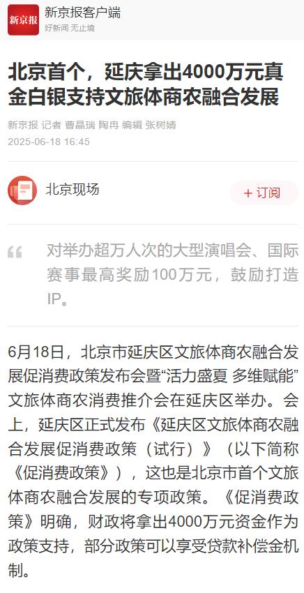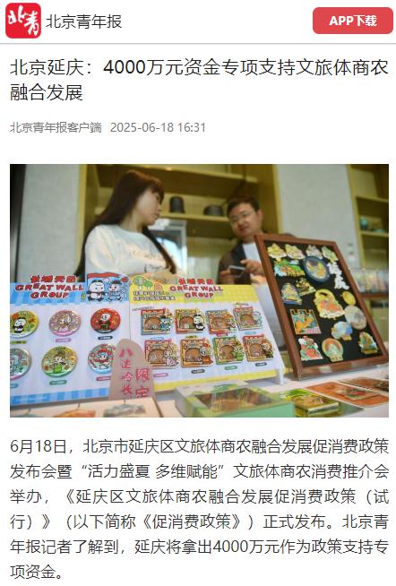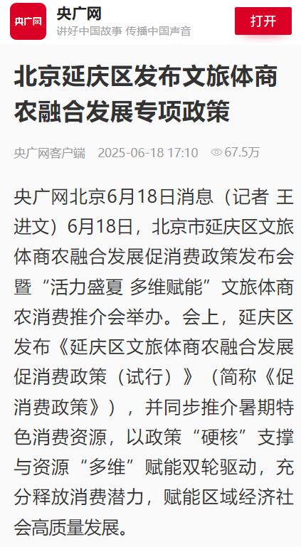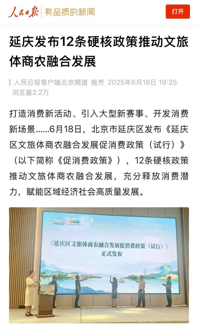 内容提要:6 月 18 北京市延庆区文化旅游体商农协同发展促进消费政策发布会暨“活力盛夏” 多维度赋能“文化旅游体商农消费推介会”在延庆区举行。会上,延庆区正式发布了《延庆区文化旅游体商农协同发展促进消费政策(实施)》(以下简称《促进消费政策》)。