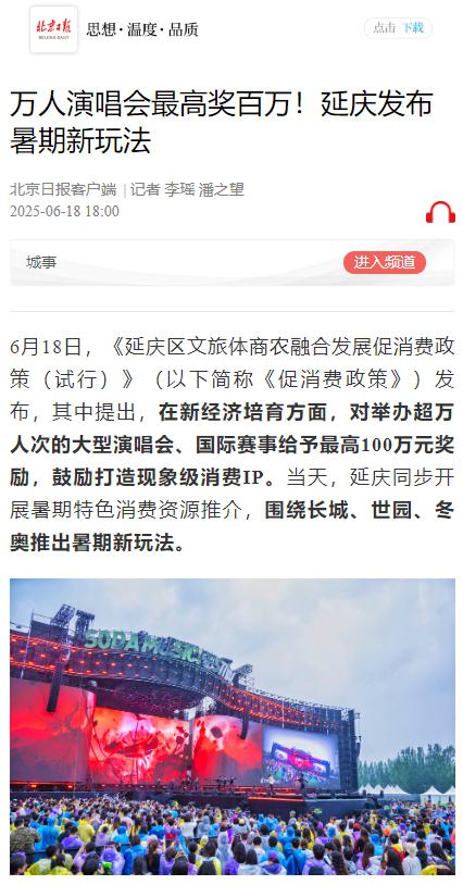 内容提要:6 月 18 日,《延庆区文化旅游、体育、商业、农民协同发展促进消费政策(实施)》发布,提出在新经济培养方面,将举办1万多场大型音乐会和国际比赛。 100 奖励一万元,激励创造卓越消费。 IP。当天,延庆同时推出暑假特色消费资源推荐,围绕长城、世园、冬奥推出暑假新游戏。