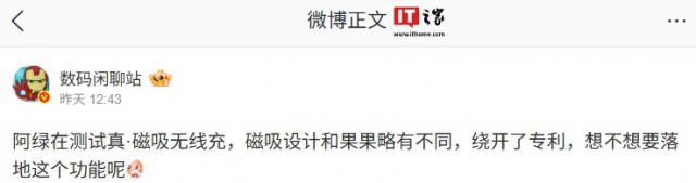 IT 世家 6 月 22 每日新闻,博主 @数码闲聊站 昨日发文透露,“阿绿”(结合过去的爆料和评论区讨论,估计是指 OPPO)在测试真・磁吸无线充,它的设计与苹果不同,绕开了专利。
