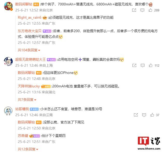 在评论区,博主列举了两个方案:" 7000mAh 普通无线充"和" 6800mAh 磁性无线充电。从这个角度来看,OPPO 磁性充电新方案少量的电池电量将被牺牲。