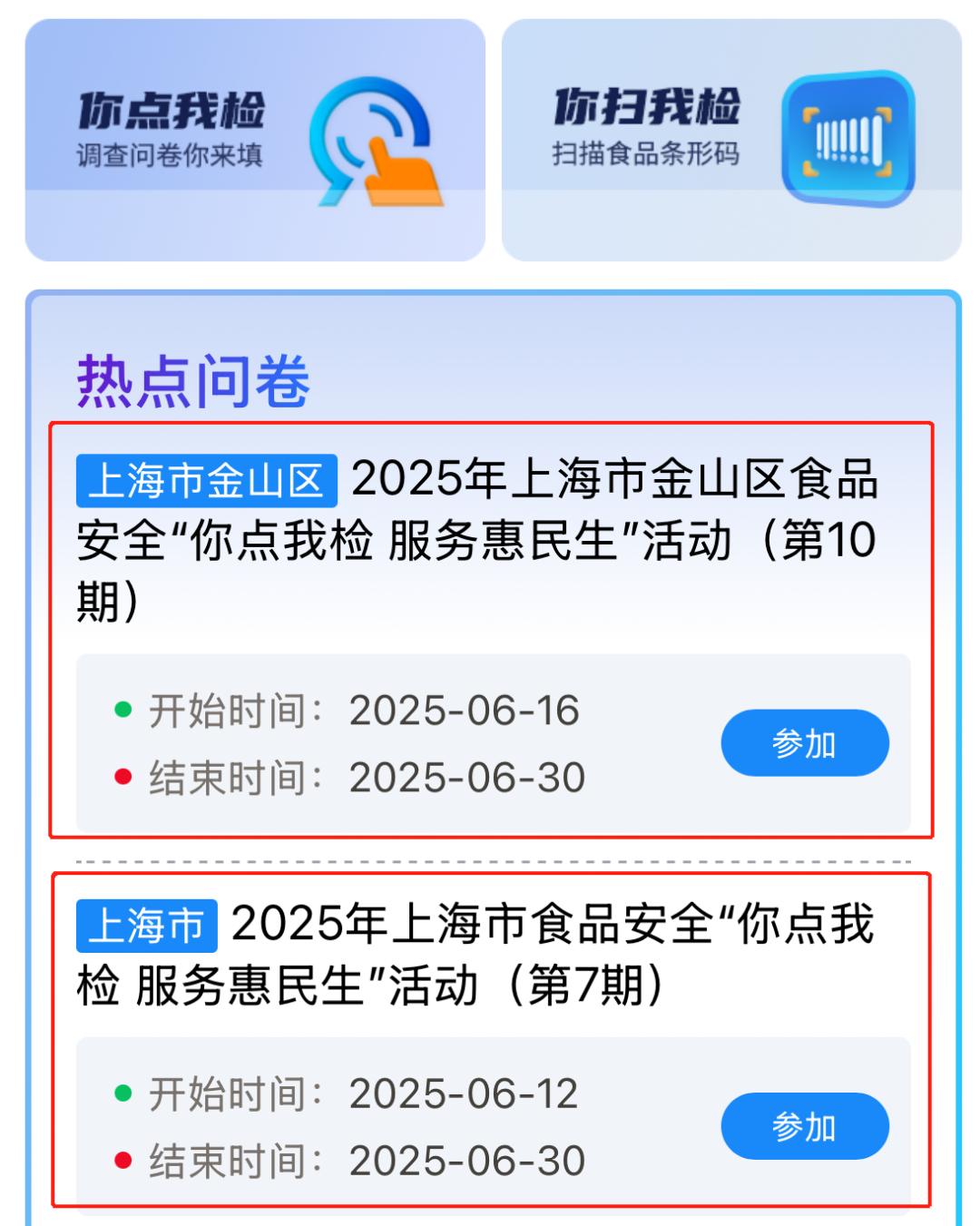选择“2025年上海市金山区食品安全” “服务惠民生”活动(第10期)或“2025年上海市食品安全” “服务惠民生”活动(第七期)】,勾选最想抽检的食品类型,检验项目。