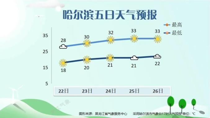 22日白天最高气温:大兴安岭,黑河,齐齐哈尔,大庆29~绥化、哈尔滨31℃26℃~28℃,其他地区24℃~26℃。