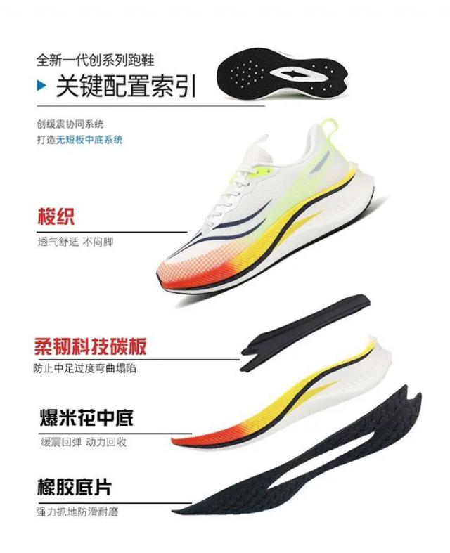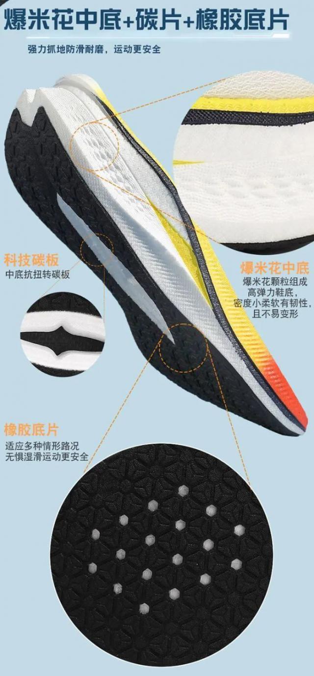 半掌碳板 Boost 技术爆米花鞋面 橡胶防滑耐磨鞋底 立体胶印透气鞋面,都是碳板跑鞋的高标准。