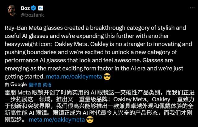 Meta CTO Andrew Bosworth(Boz)表示,雷朋 Meta 眼镜开辟了时尚实用的眼镜 AI 眼镜是一种突破性的产品类型,我们正在进一步拓展这一领域,推出另一个重量级品牌 :OakleyMeta。Oakley 我们一直致力于创新和突破界限。我们很高兴推出全新的高性能,兼顾卓越的外观和佩戴体验。 AI 眼镜。