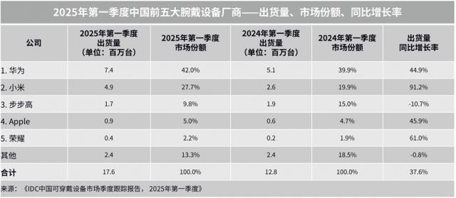 而且在全球腕戴设备市场,IDC 资料显示,今年一季度全球腕戴设备(包括智能手表、智能手环)市场出货 4557 万台,同比增长 10.5%。西欧、美国、拉美和亚太(印度除外)等地区均受全球市场复苏和关税贸易影响,加快出货节奏,呈现明显增长,但中国市场受国补刺激增长。在中国腕戴设备市场上,出货量为 1762 万台,同比增长 37.6%。