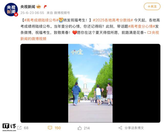 IT 世家 6 月 23 据央视新闻报道,日消息,2025 今天,普通高校全国统一招生考试(高考)成绩陆续公布,今日上海考生可查成绩,其他省市成绩陆续开放查询。。