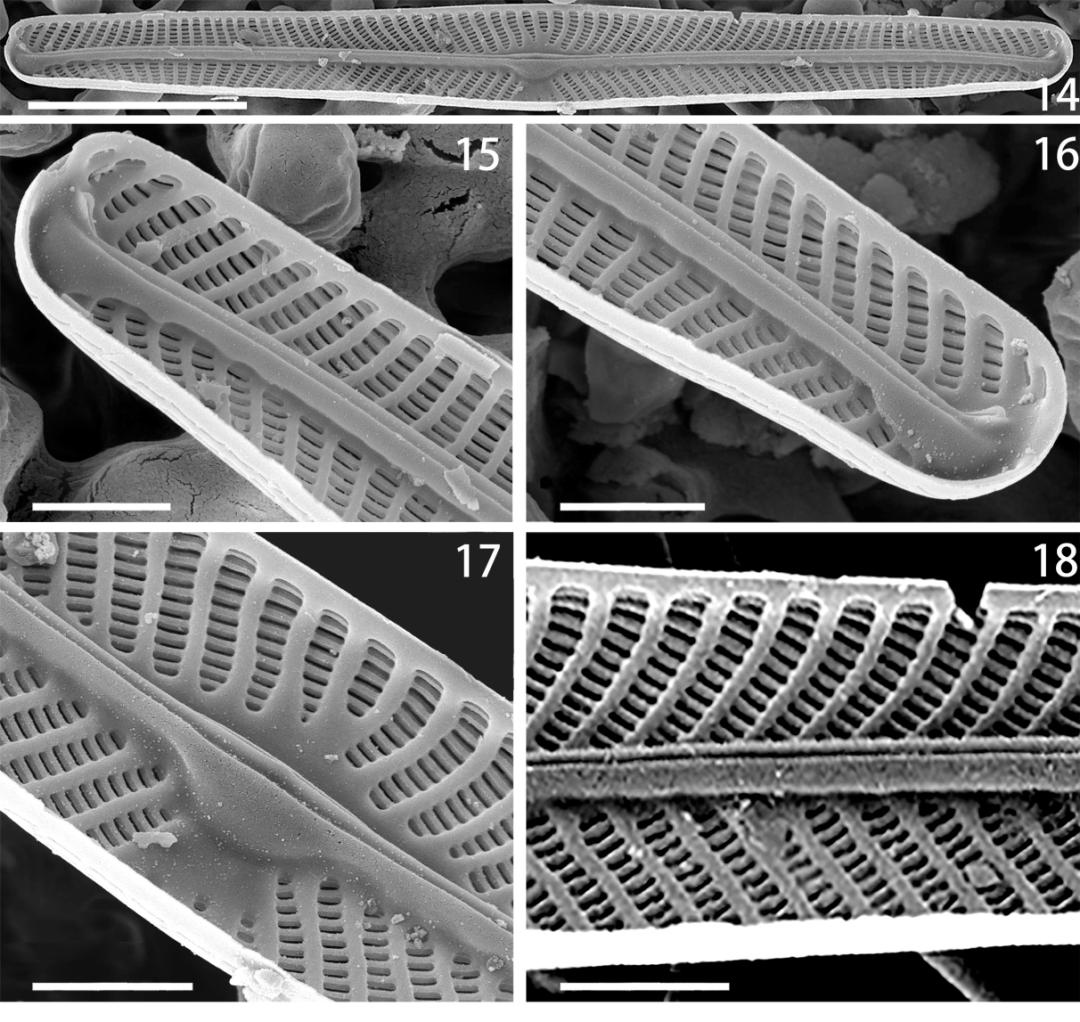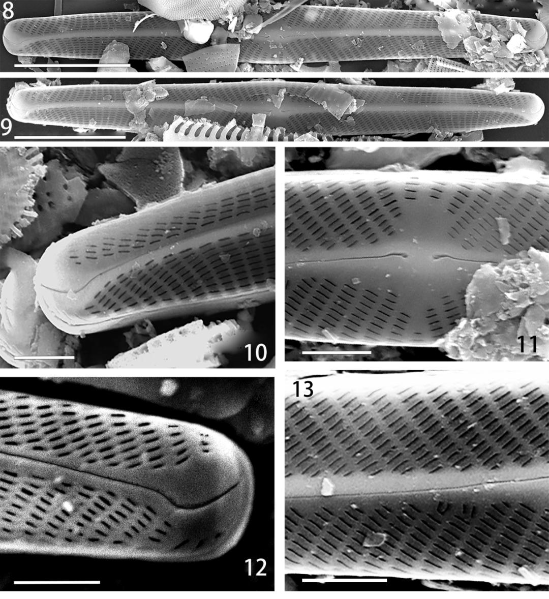 前措舟藻的壳面呈线性至条状披针状,中心略宽,两侧宽圆。壳体大小为:长42.7~51.2μm,宽4.9~6.1μm,宽高比8.2。中轴线区域线性狭窄,中心区域小而椭圆,偶有2~3条短线纹。壳缝直,近缝端稍微向二次侧弯,远缝端钩延伸至壳面边缘。在内壳表面,中央结节上有半披针垂直变厚,远缝端端有螺旋舌。线条呈放射状排列,密度为14~16/10。μm,两边略微收敛。孔纹为垂直线纹,密度为50/10μm,排列非常紧密。