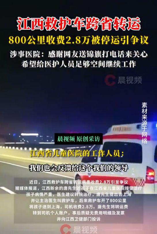 最近,江西省救护车跨省转运病人收费 2.8 一切都引起了争议。据媒体报道,江西新余唐先生的孩子在江西省儿童医院接受治疗。孩子病情严重,医生建议转院治疗。唐先生提出去上海,让主治医生叫救护车,然后救护车开了。 800 把孩子送到上海公里,司机收费。 2.8 万。唐先生将转运费转入司机个人账户,后来质疑无费用明细及发票,并向江西卫健部门投诉。6 月 18 日,江西省卫生健康委对此事发布通知。江西省儿童医院没有符合跨省转运要求的救护车。在诊疗医生联系赣医院救护车后,医院派出了两名医护人员护送车辆,并携带使用。 ECMO(体外膜肺氧合)及其他相关抢救设备和药物。经调查发现,方南昌赣医院所有救护车收费不合理等问题,已责令其退还不合理收费,并暂停医疗转运服务。下一步将进一步检查此事。这个问题引起了争议,有网友支持医院和医护人员的做法,认为是“限制抢救生命的突破程序”。6 月 23 日日,潇湘晨报记者联系南昌市 12345 体现了网友的意见,工作人员表示已经收到了几次体现,已经交给了相关职能部门。