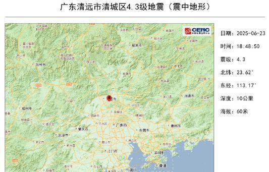 06 月 23 日 18 时 48 分为广东清远市清城区(北纬市 23.62 度,东经 113.17 度)发生 4.3 级别地震,震源深度 10 千米。这次震中距离广州城区。 55 在地震中,广州、深圳、中山、佛山、东莞、珠海等地都有明显的震动,地震造成了强烈的震动。震后中国地震预警网 5.3 秒自动生产此次地震的预警信息,小程序“中国地震台网”向震中周边地区发出。 50.2 万客提供预警信息服务,费时, 591 ms。