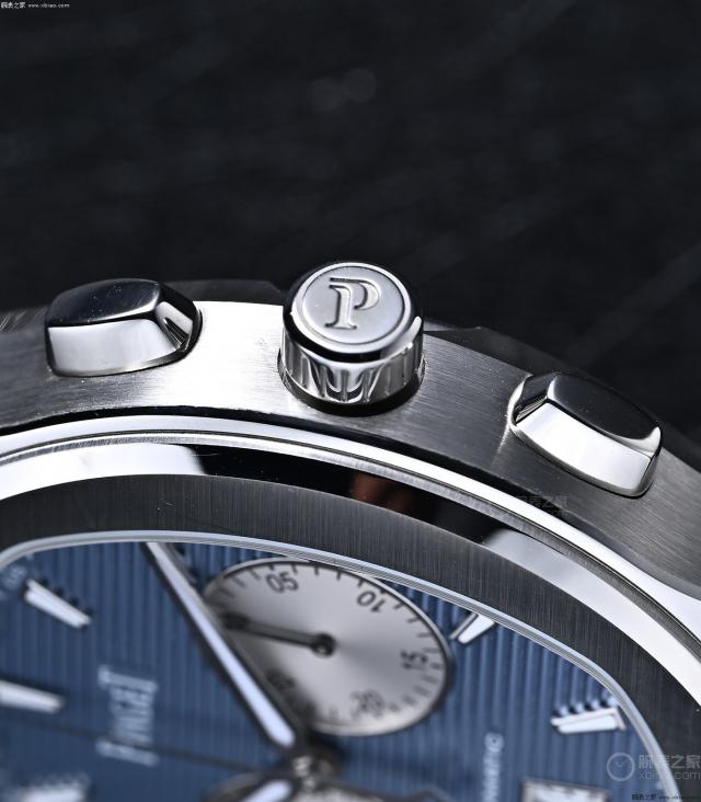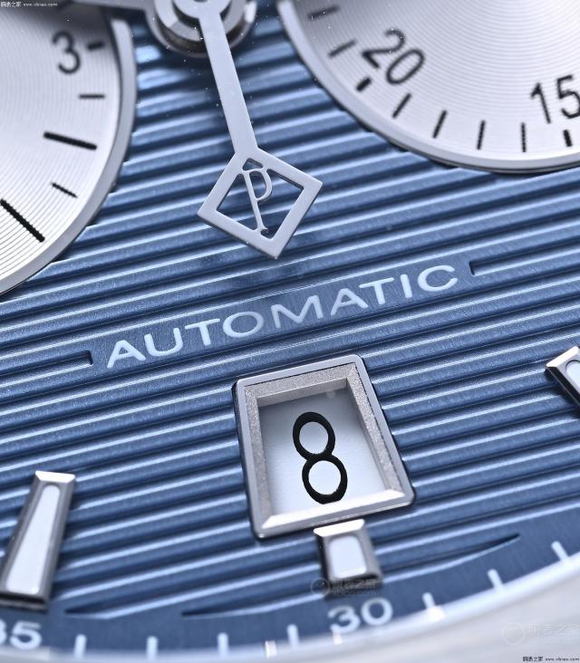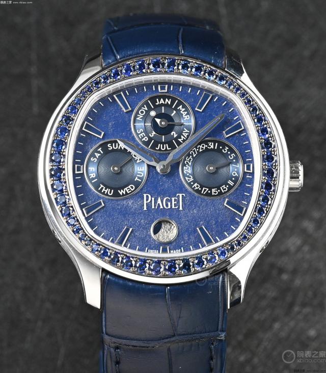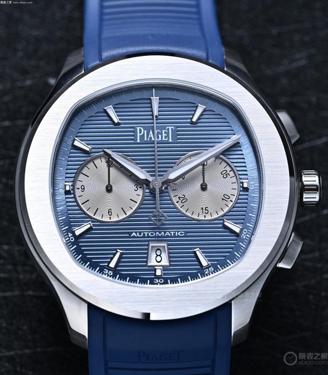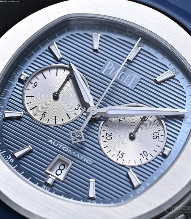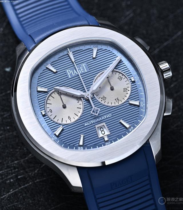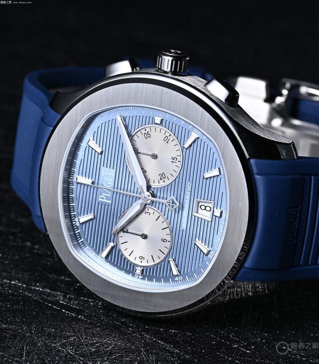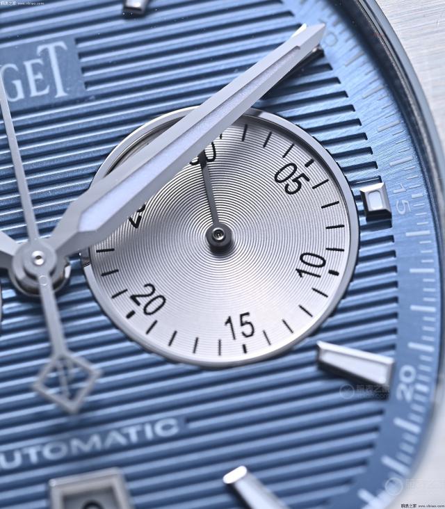 在 POLO 在此基础上,记时款增强了“双眼”记时盘。左边是 12 小时记时盘;右边是 30 记时盘,伯爵 POLO 记时没有小秒针。记时盘不仅有唱片纹装饰,而且记时盘边缘还有金属边框。除了目前主要的冰蓝盘和绿盘,POLO 此前还推出了“蓝熊猫”(蓝眼睛),颜值都很高。