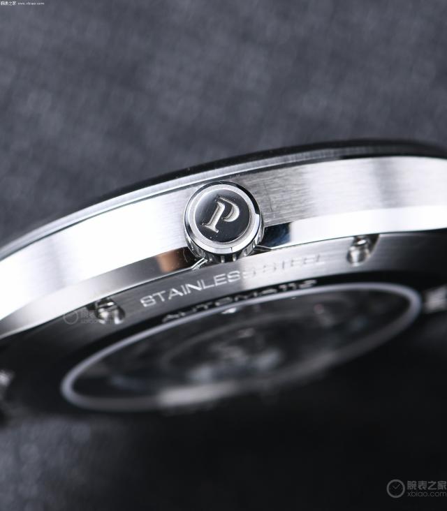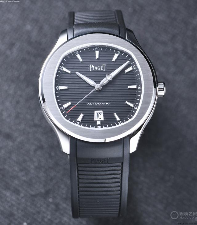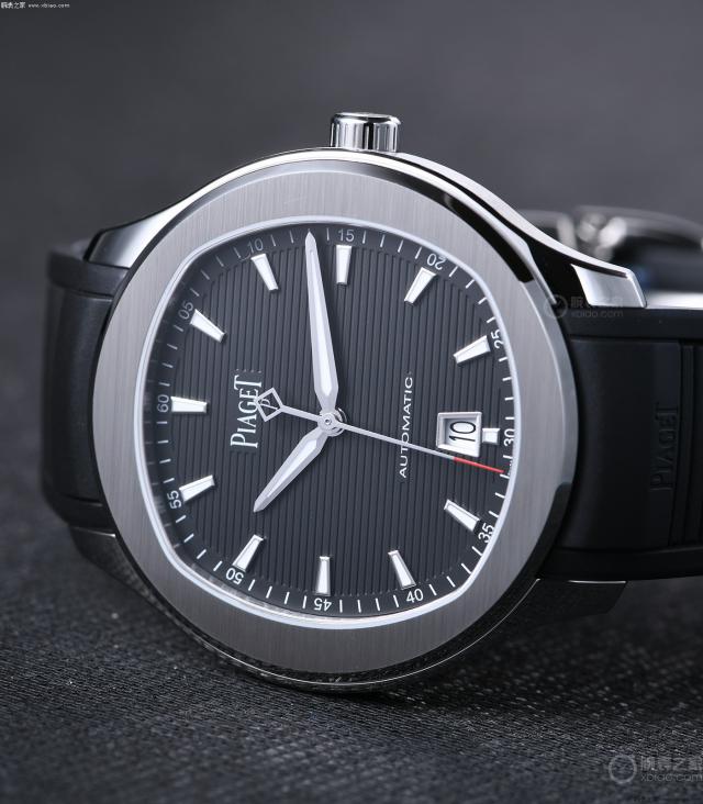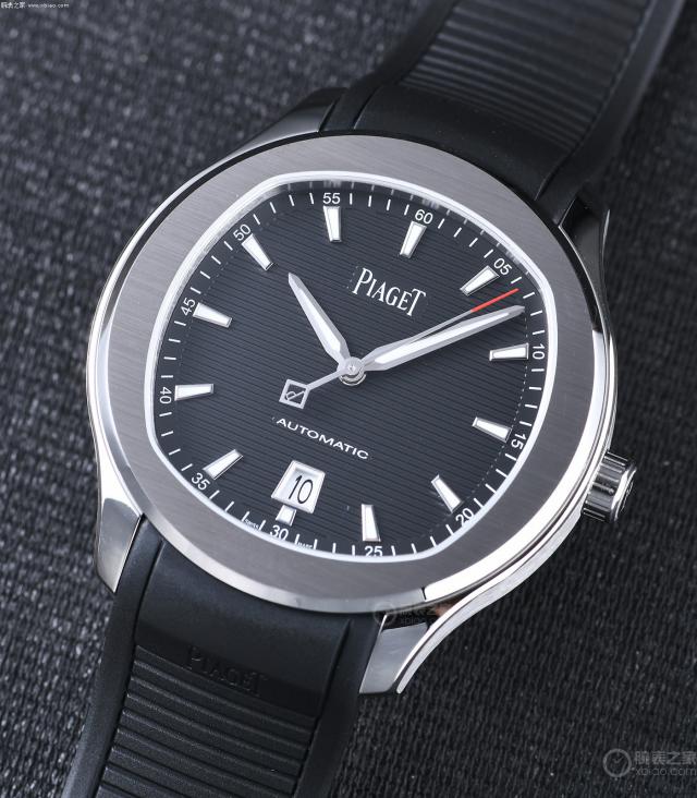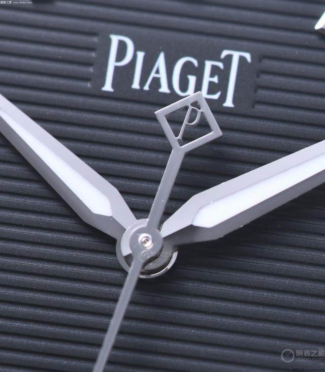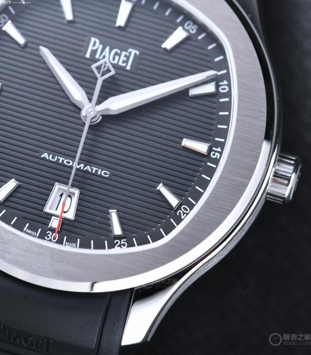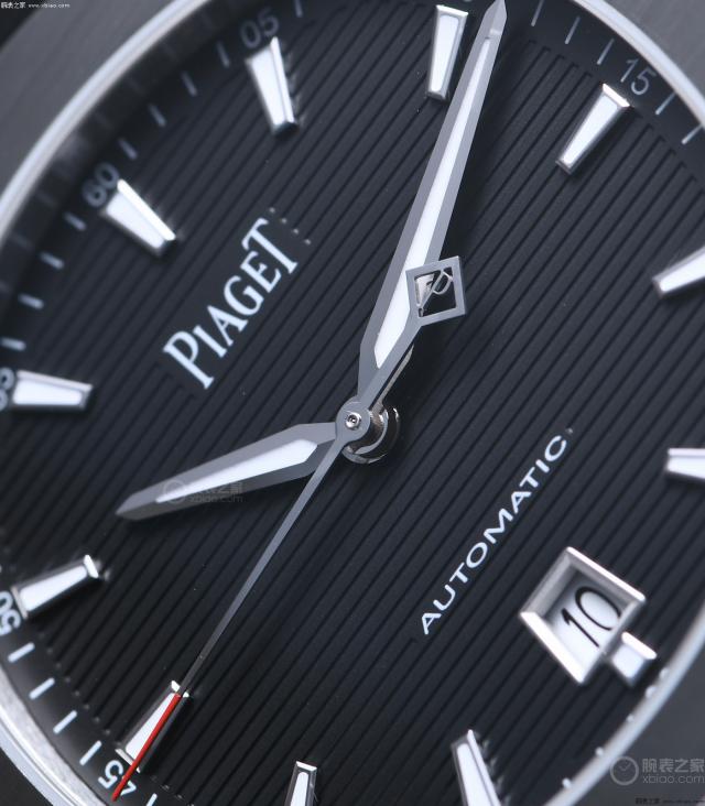 伯爵 POLO 表圈正面全部水平拉丝。水平拉丝,结合盘面水平甲板线条,呼应了之前的第一代和第二代伯爵。 POLO 标准纹理装饰。盘面上的剑形指针和立体时标都有大规模的夜光。在秒针的末端,有伯爵英语PIAGET的字母。 P 镂空。6 点位日历窗有抛光的外框,还有喷砂的倒角,细节十分到位。