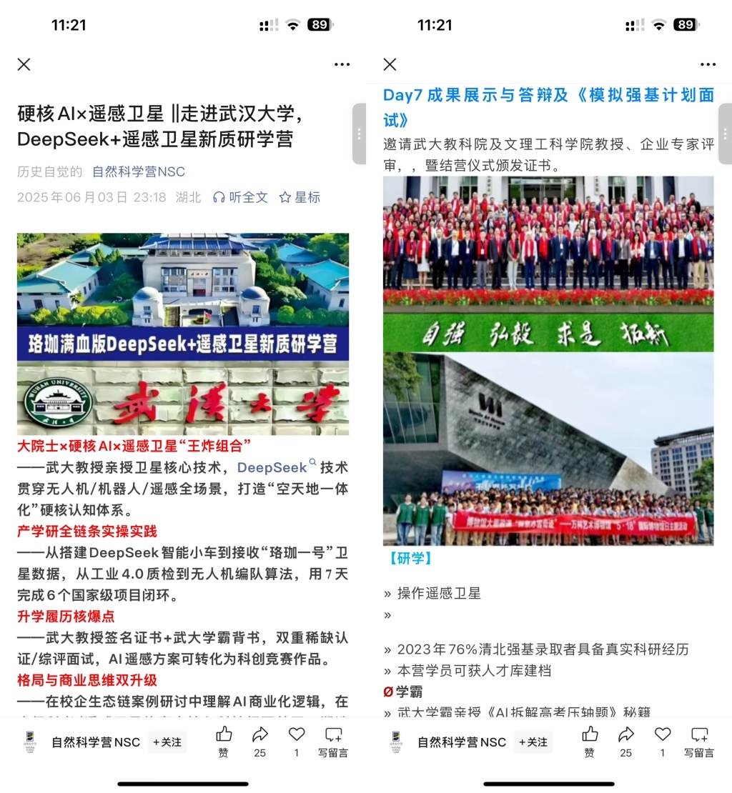 武汉大学发表声明的背后,“魔豆梦工厂”、“瑞涉奇研究”等机构利用“武汉大学强基计划”、“李德仁院士团队”等相关概念发布了“2025年武汉大学硬核科技研究夏令营”,声称“武汉大学教授授予卫星核心技术,7天内完成6个国家项目闭环”;"武大教授签名证书 武大学霸背诵,双重稀缺认证/综合评价面试,AI遥感方案可以转化为科技竞赛作品等。