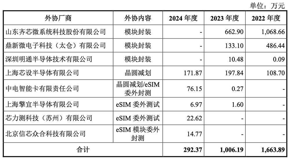 报告期内,新恒汇外包加工服务主要包括智能卡模块包装测试服务、晶圆减划服务和物联网eSIM芯片包装测试服务的模块包装测试服务。外包加工费分别为0.17亿元、0.10亿元和0.03亿元,占营业成本的3.59%。、2.10%、0.54%。