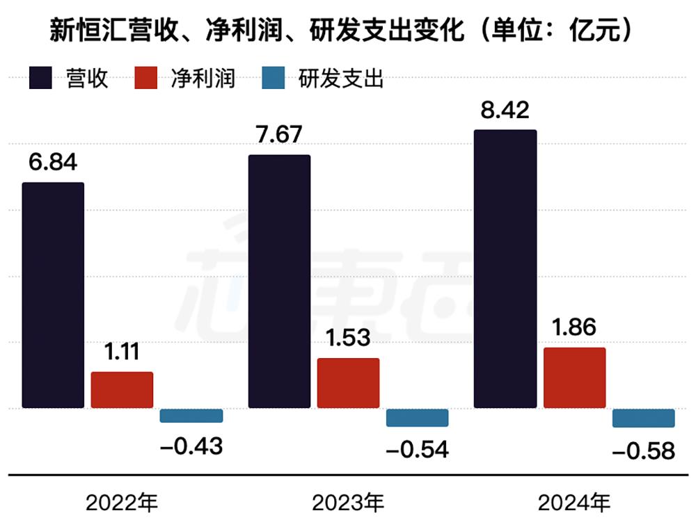 新恒汇在2022年、2023年、2024年的利润分别为6.84亿元、7.67亿元、8.42亿元,净利润分别为1.11亿元、1.53亿元、1.86亿元,R&D支出分别为0.43亿元、0.54亿元和0.58亿元。