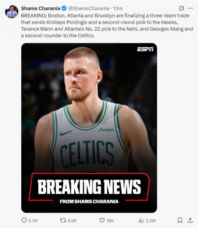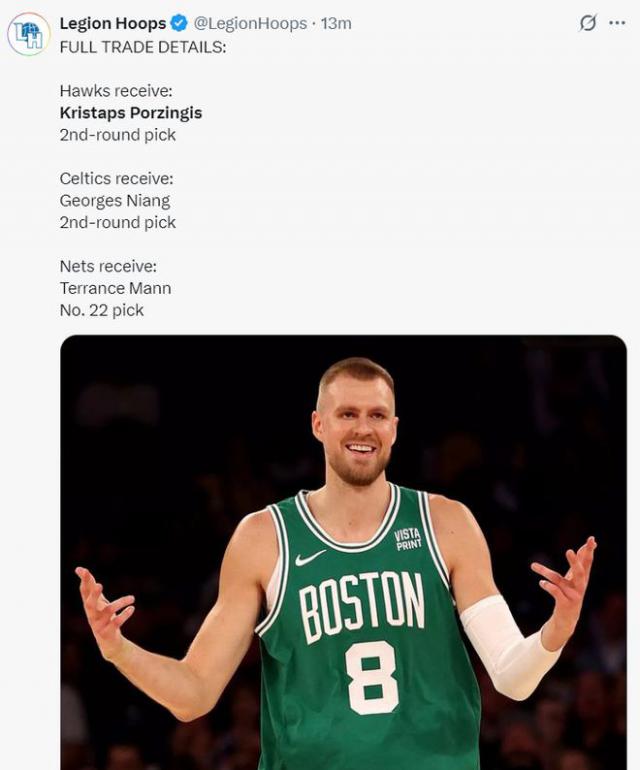北京时间 6 月 25 日,ESPN 名记 Shams 据报道,篮网、凯尔特人和老鹰达成了三方交易,老鹰获得了波尔津吉斯、1。 个轮签;篮网获得曼恩,2025 年老鹰 22 号码签名,绿凯得到乔治 - 尼昂、1 个次轮签。