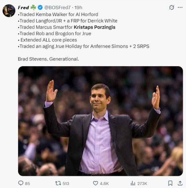 凯尔特人媒体晒出史蒂文斯变成绿色凯尔特人 GM 后的功绩:
