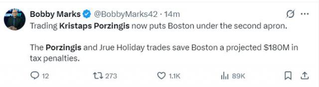 薪酬结构专家鲍比 - 马克斯写道:现在交易掉波尔津吉斯的凯尔特人已经在第二个土豪线下了,波尔津吉斯和霍勒迪的交易免除了绿凯。 1.8 十亿奢侈税重罚。
