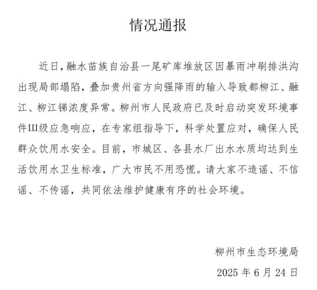 近日,由于暴雨冲刷排洪沟,融水苗族自治县一个矿库堆放区局部坍塌,贵州省输入强降水导致柳江、融江、柳江钒浓度异常。柳州市人民政府及时启动了突发环境事件 III 级别应急响应,在专家团指导下,科学应对,确保人民群众饮用水安全。当前,市城区、县水厂出水水质均达到生活饮用卫生标准,广大群众不必恐慌。请不要造谣,不要相信谣言,不要传播谣言,共同维护健康有序的社会环境。
