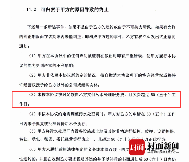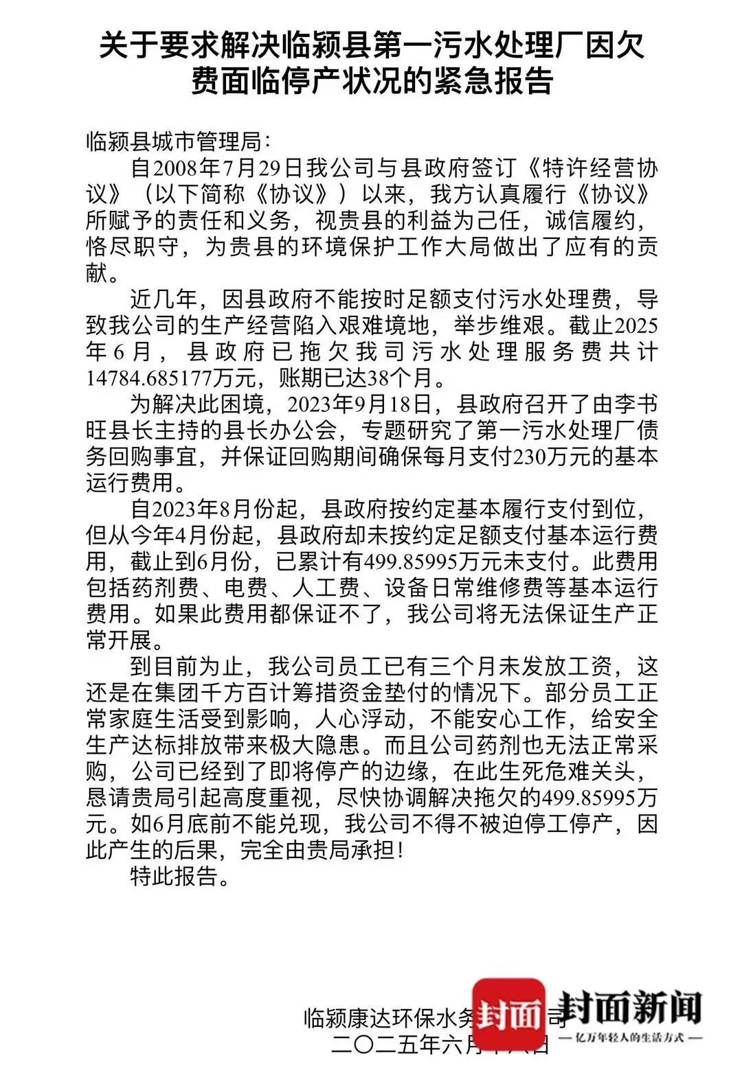 近日,封面新闻收到河南临邈一家水务公司的云投诉。该公司相关负责人表示,2008年,该公司与临邈县政府签订协议,在当地经营污水处理厂。从签订协议到今年6月,临邈县相关职能部门一直没有向企业支付足够的污水处理服务费,累计达到1.4亿元,账期长达38个月。