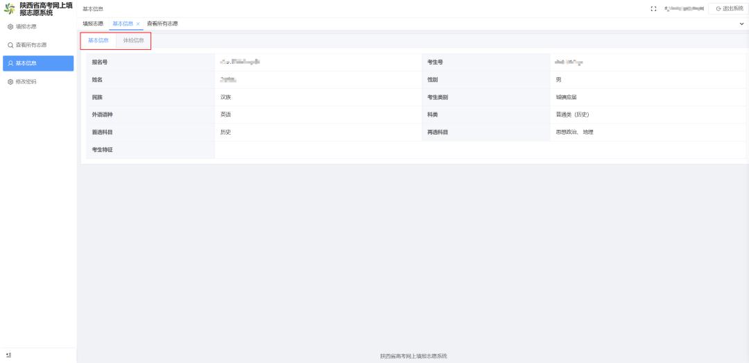 2.单击“基本信息”查看个人基本信息和体检信息,了解自己有限的院校和专业。
