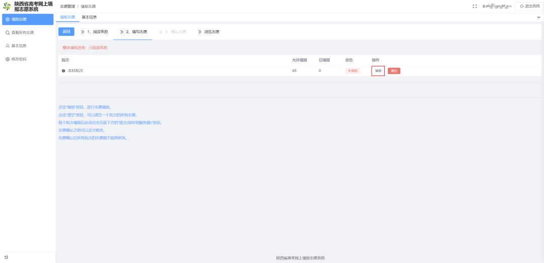 点击操作中的“填写”按钮,在“填写页面”中进入志愿填写目录。