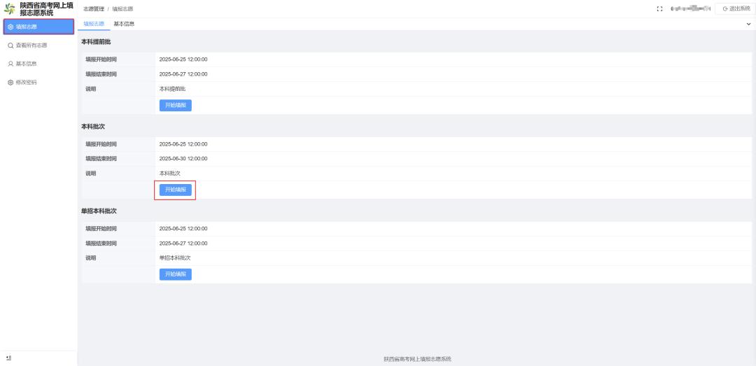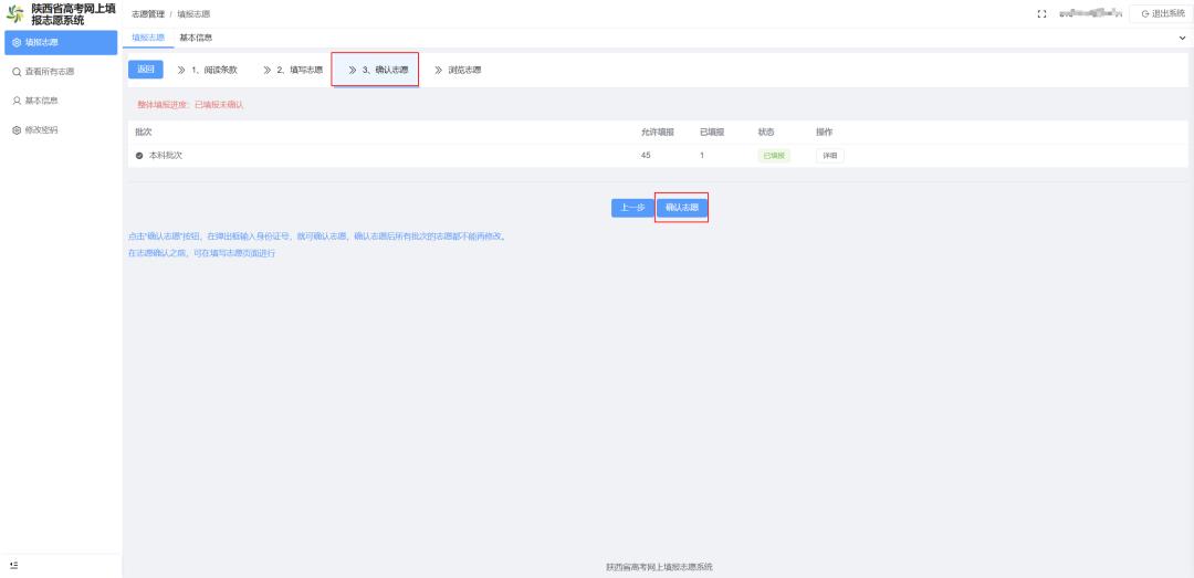 所有填写时间段内的批号和类型完成填写并确认后,点击右上角的“退出系统”按钮,完成志愿填写。
