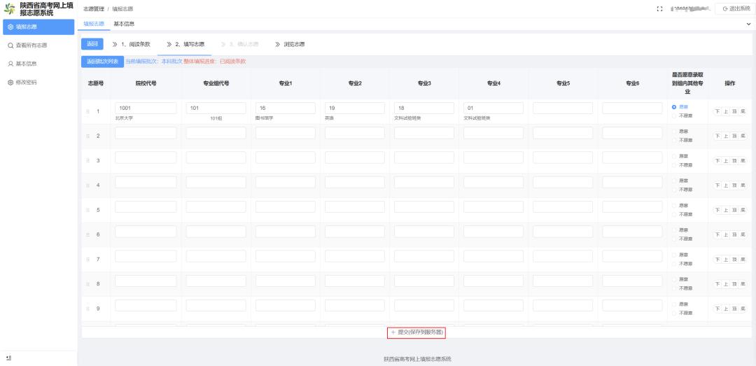 6.根据自己的情况,在“志愿填写列表”中依次填写志愿信息,然后点击“提交(保存到服务器)”按钮进行志愿提交。