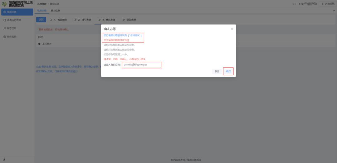 特别提示:在第一阶段填写志愿者的考生,如同时填写本科提前批次和本科批次,在填写本科提前批次中所有可填写的类型后,需要点击“确定志愿者”按钮,核对已填写的批次号,输入身份证号确认;当所有本科批次都可以填写的类型完成后,仍然需要点击“确定志愿者”按钮,核实已填写的批次号并重新输入身份证号进行确认。