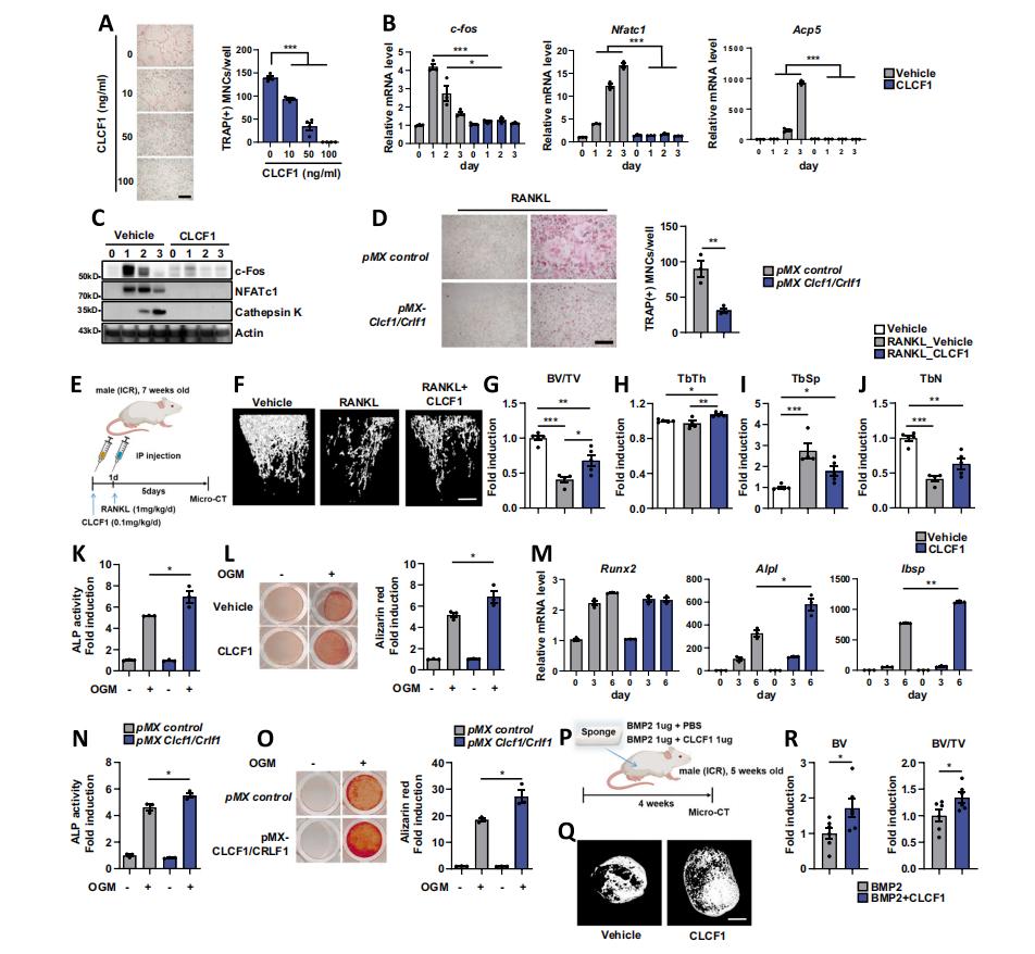 随后,研究人员将CLCF1注射到老年小鼠的腹腔中。CLCF1改善了小鼠的肌肉功能,抑制了骨质恶化。具体来说,它可以有效抑制破骨细胞的活性,适当刺激成骨细胞的功能,从而促进骨量的增加。