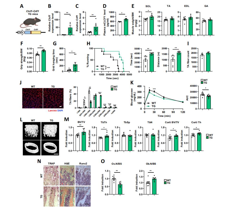 实验还特别生成了一种转基因,表达CLCF1。(TG)与野生型相比,小鼠构建CRLF1复合物增强分泌,(WT)小鼠,转基因小鼠表现出较强的肌肉力量和较高的骨密度。