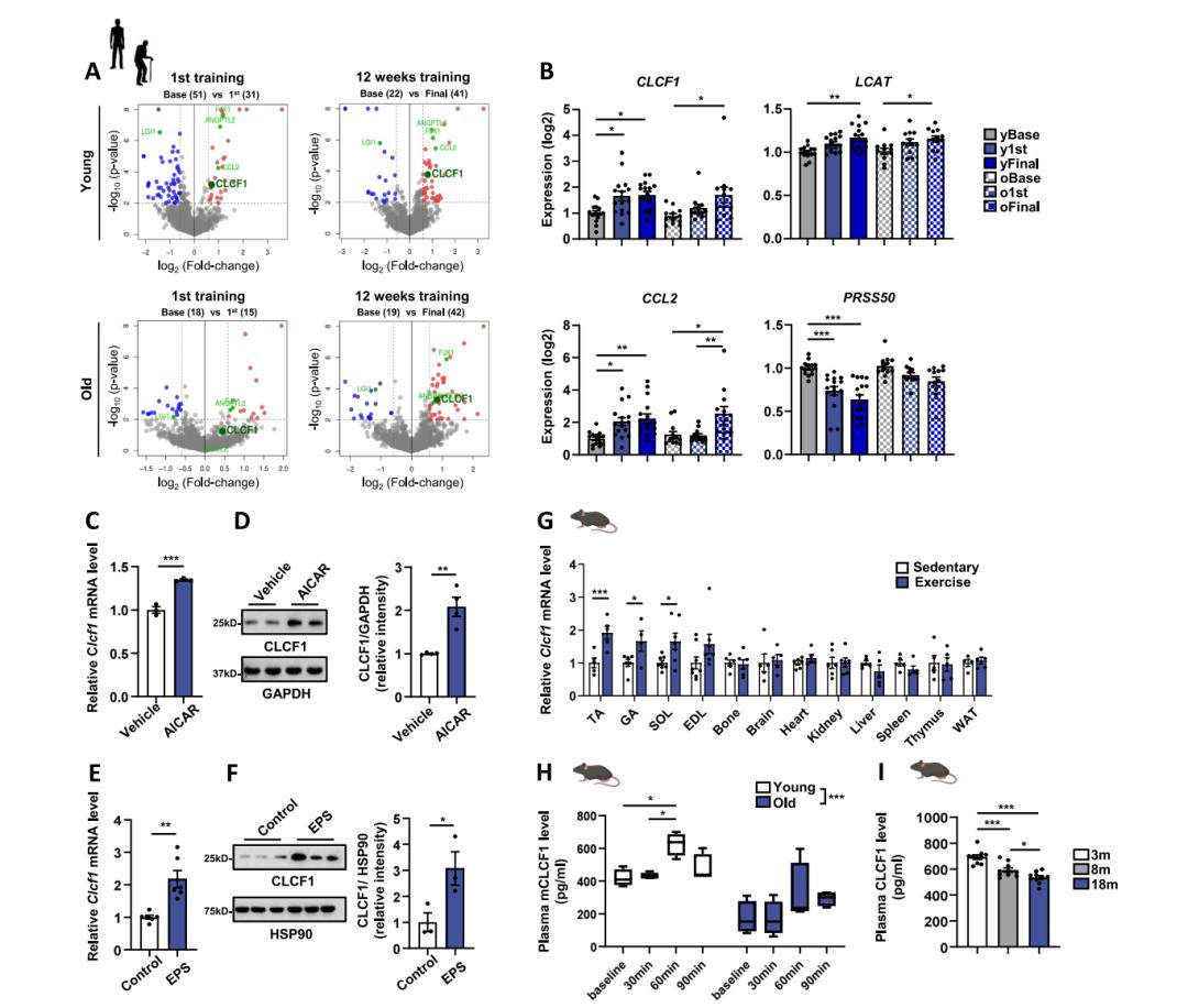 为了进一步了解CLCF1是如何应对运动和衰老的变化,他们将参与者分为年轻组和老年组。此外,他们还引入了年轻的老鼠和老鼠同时参与实验,监测运动后血液中CLCF1水平的变化。