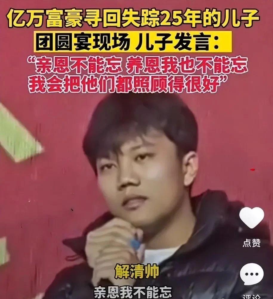 2023年11月底,他被拐卖了25年,解清帅和他的家人得到了认可。小时候被拐卖,在留守家庭长大,亲生父亲疑似亿万富翁,在亲戚会上说:“你不能忘记你的善良,你不能忘记你的善良”...在这种“逆天而行”的叙事背景下,解清帅的人生故事被很多媒体报道,立刻成为人们关注的焦点。