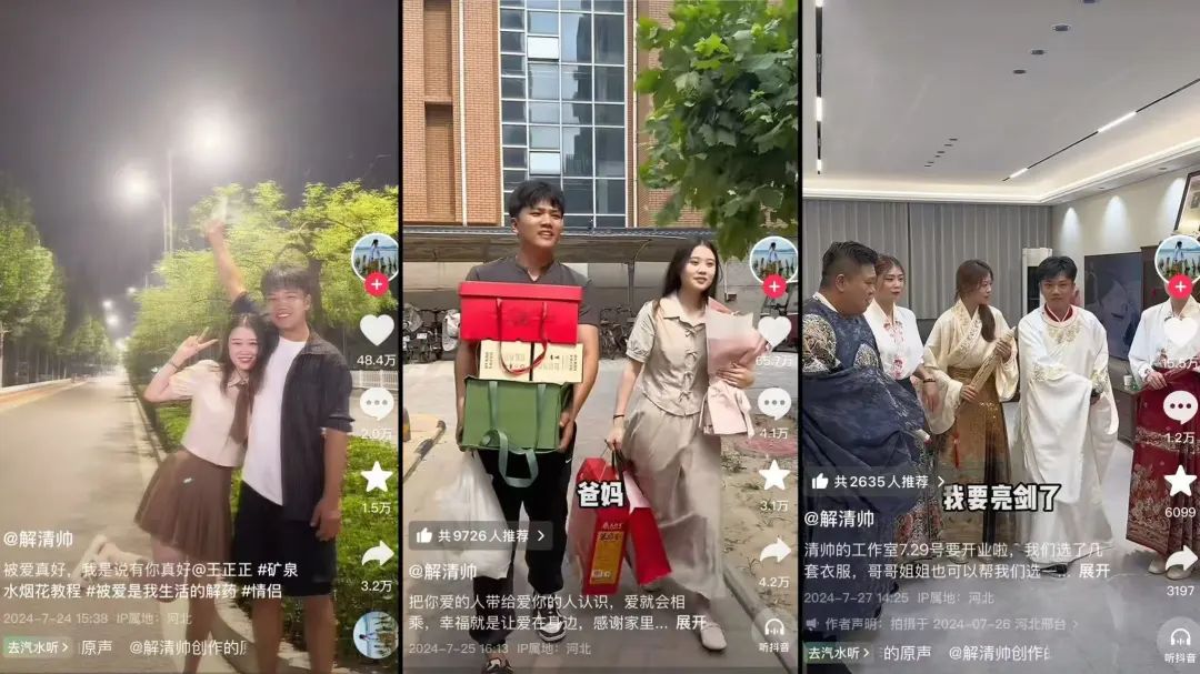 比如2024年7月,解清帅的女朋友公开露面,账号发布了几段表白、约会、见父母的甜蜜记录视频,赞了几万到几十万,成功创造了新的话题点。与此同时,账号粉丝数量明显增加,直播间业绩也发展迅速。