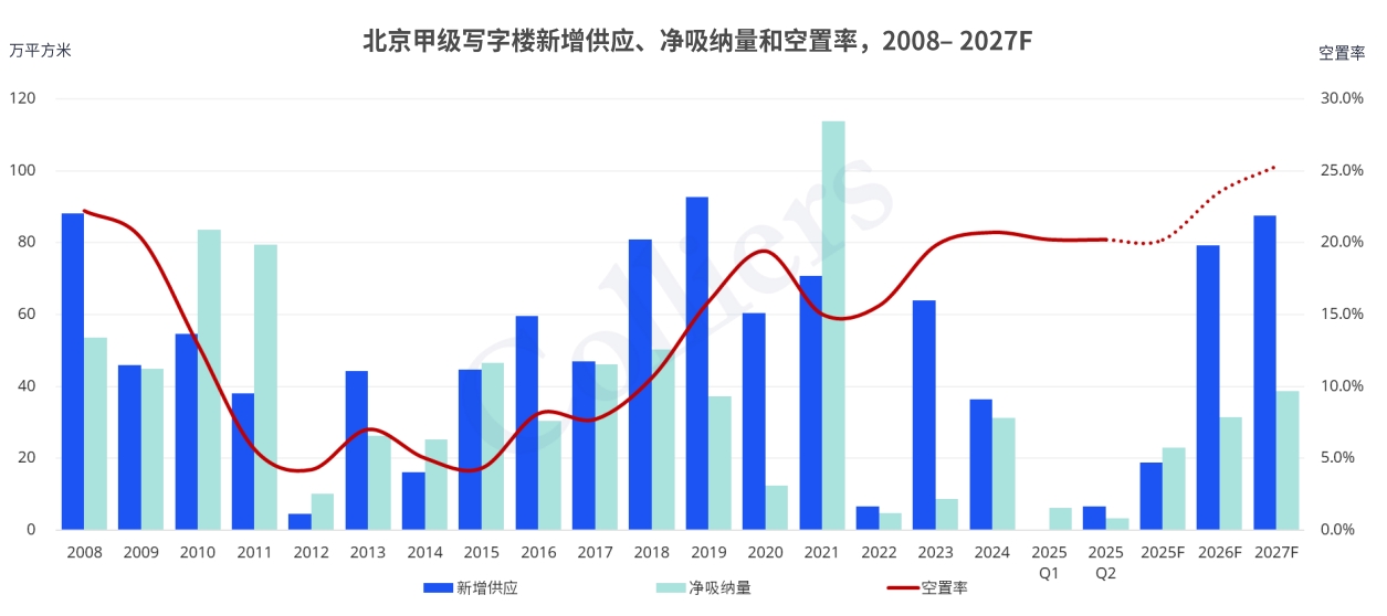 在各个商业区,丽泽商务区本季继续强劲去除动能,单季净吸收量突破2万平方米,上半年累计超过5万平方米。这一轮扩张主要受到国家央企办公需求集中释放的驱动,将空置率降至21.5%,预计年底将进一步跌破20%。