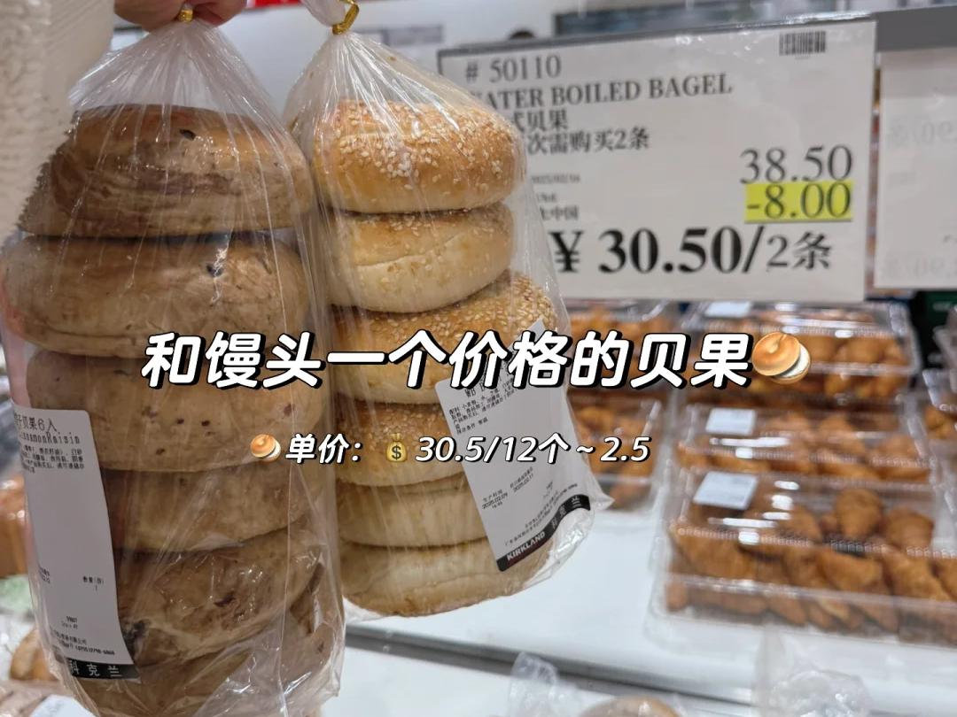 在B&C、Fascino、One 像Bagel这样的面包店,单个贝果要10元以上,号称「贝果世界天花板」纽约贝果博物馆也有很多贝果,价格在30元左右。但是在山姆,蔓越莓贝果7个23.8元;Costco的肉桂提子贝果6个19.5元,被小红书用户戏称为「贝果和馒头价格一样。」。