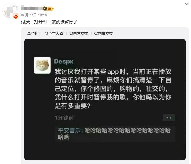 最近,“讨厌一打开 APP 歌曲便被暂停”的话题引发网友热议,不少网友批评非音视频类。 App “越权”行为。很多网友在相关话题下抱怨这种行为。其它社交平台也不乏网友发帖质疑相关网友。 App “无边界感”“无赖”等等。