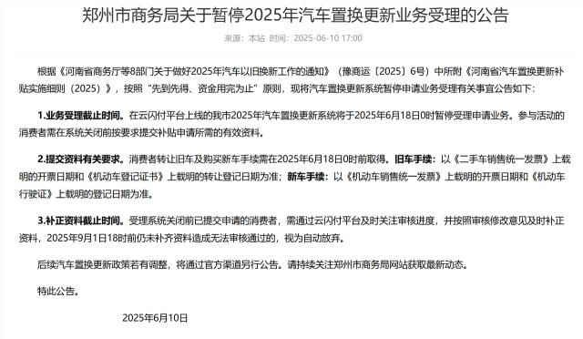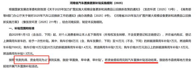 也许你会觉得事情突然发生了,但其实在政策颁布之初,就写得很清楚了。比如《河南省汽车置换更新补贴实施办法(2025)》就明确规定了。 " 名额有限,资金用完了。 " 原则上,提前用完就提前结束。
