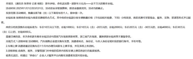 另外,还有其他的区级补贴,但并非所有的区都有,比如今年 1 月 -3 月份,杭州余杭区有新车购车补贴,按购车价格补贴。 1000-6000,不能和国补一起使用(有些区补也可以一起使用)。