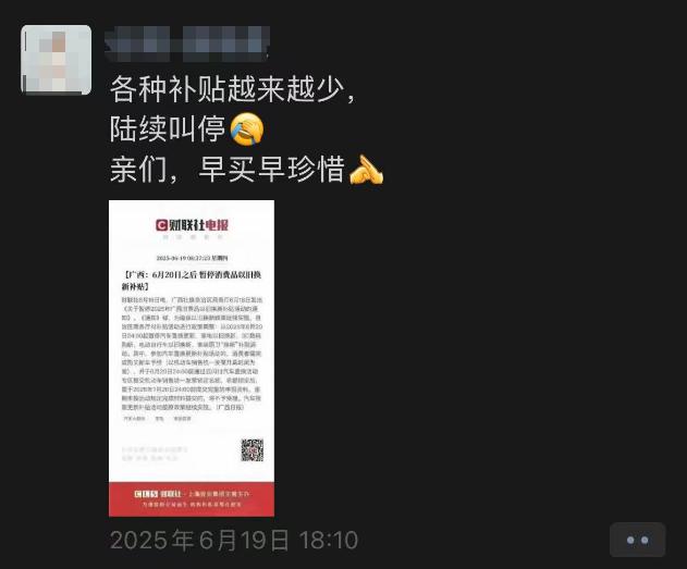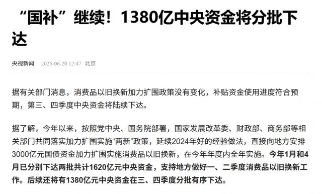 没有,最近央视新闻已经说了这件事,在第三季度和第四季度,中央政府将再次增加补贴 1380 亿国债,继续这一消费补贴计划,这个时候的间断,很可能只是我们国家一步一个脚印的战略,本质上是一件好事。