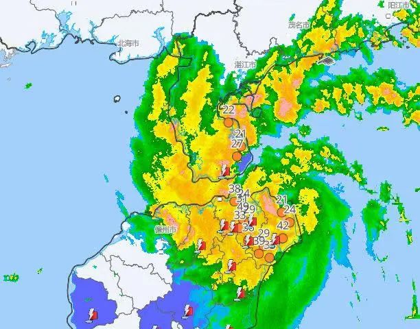 受热带低压影响,我市演丰镇近1小时降水量已达53.5mm,预计未来6小时城区、演丰镇、灵山镇、三江镇、大致坡镇、云龙镇、三门坡镇仍将降水40-60毫米,建议有关单位和人员做好预防工作。