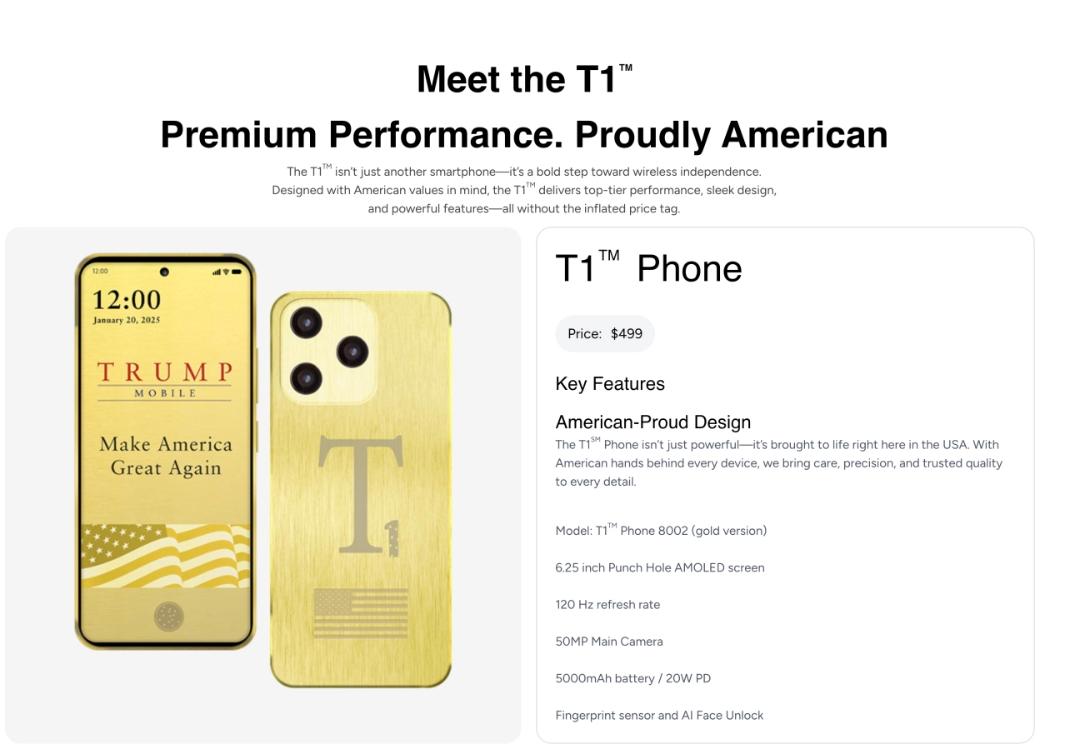 在铺天盖地的宣传中,最引人注目的卖点是首页显眼的横幅:“T1是美国制造”(MADE IN THE USA)。特朗普家族在新闻发布会上言而有信,声称这款手机是为爱国者量身定做的。