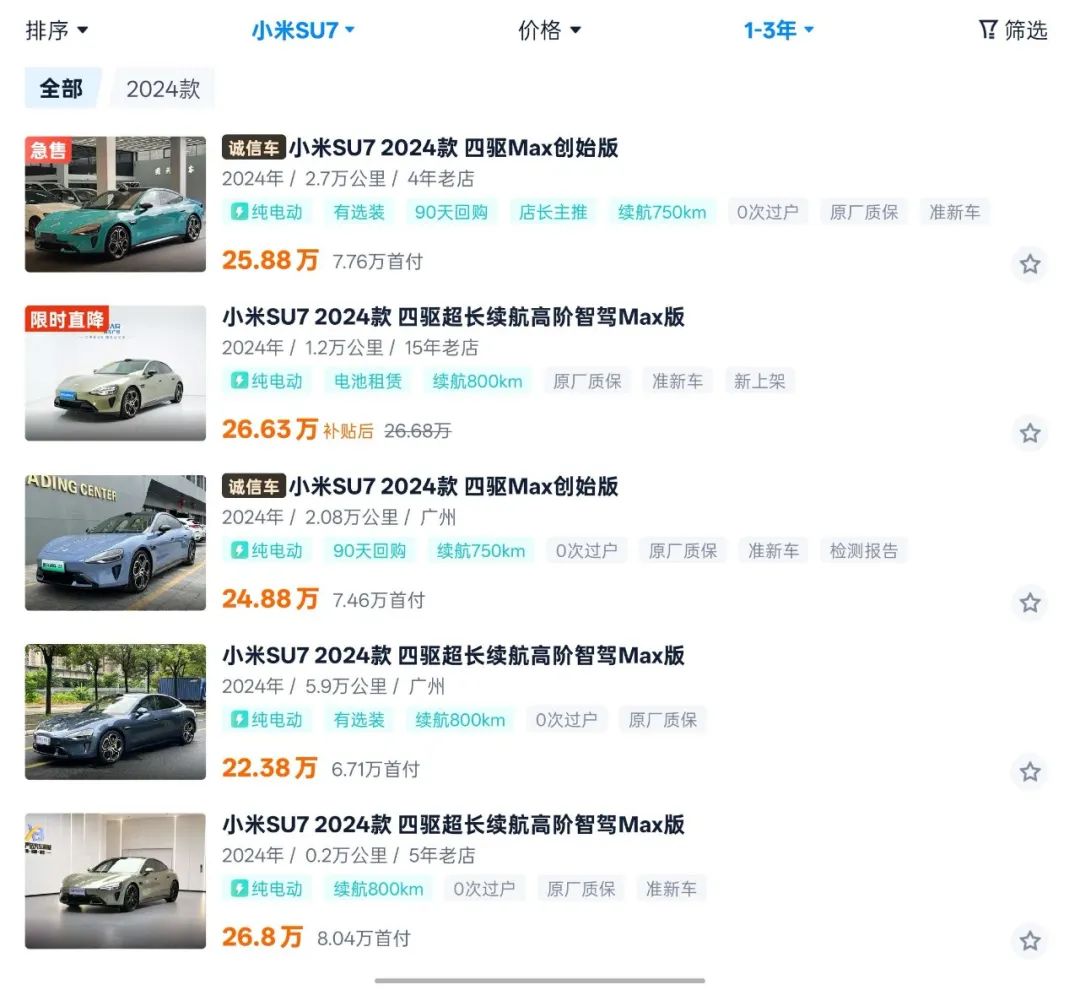 事实上,小米SU7除了被各种订单和准新车投机外,还将视野拓宽到主流二手车市场。根据源Auto的安排,目前市场上一年行驶里程在3万公里以内的二手小米SU7折扣幅度一般在3万左右,其中顶级小米SU7 Max折扣会稍微高一点,是中国汽车流通协会评定的1年纯电动汽车保值率TOP。 1。