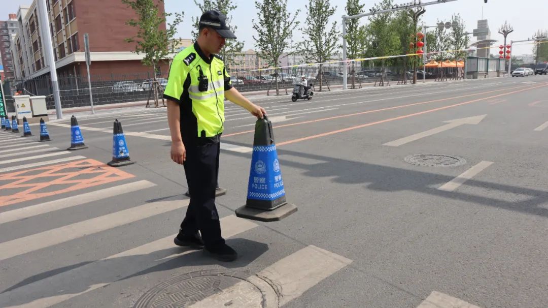护理交警提前到位,在考点周边实行精细化交通管理。对考点周边道路进行全面调查,放置反光锥,拉设显眼警戒带,设置禁音标志和交通标志,分时段对考点入口道路进行临时交通控制。
