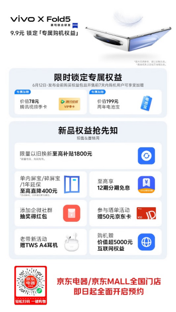 vivo X 7月2日Fold5将现货发售,JD.COMMALL。、京东电器全国线下门店样机已进店感受,同时开启新机预约,首次购买享受新旧置换无上补贴1800元等7大权益。