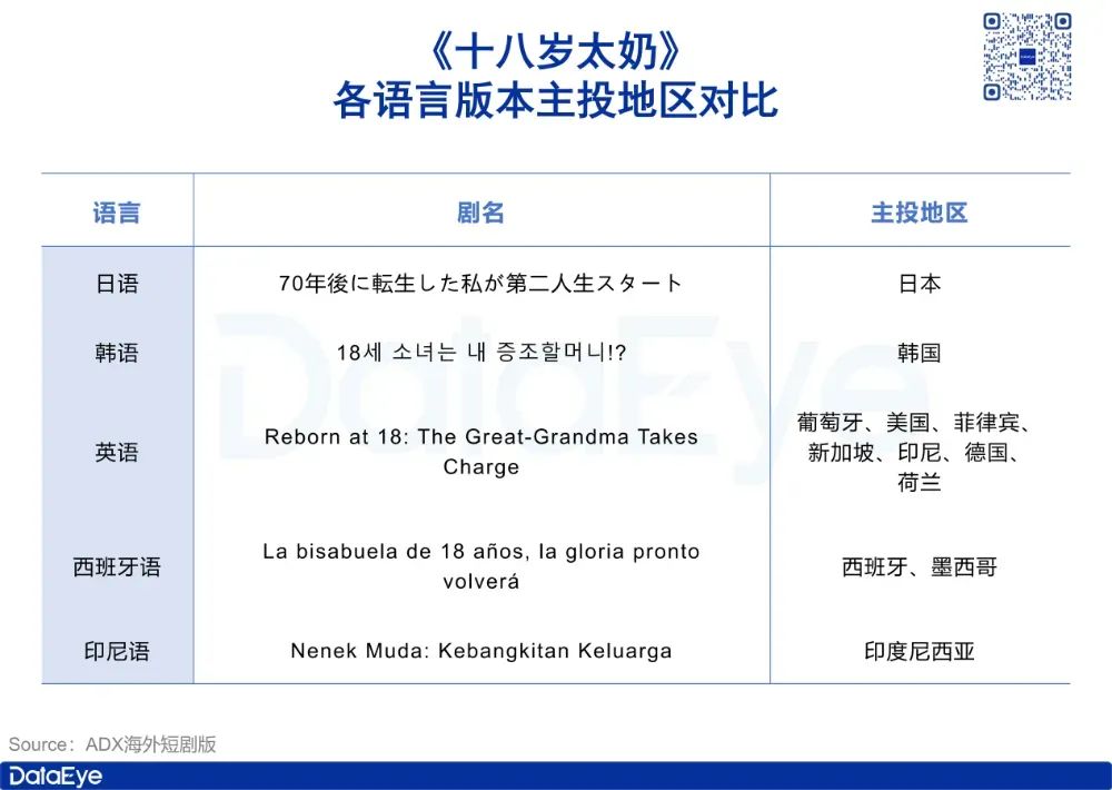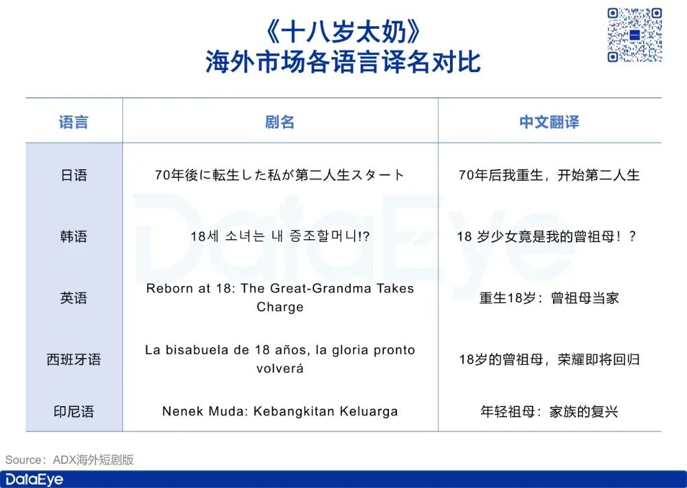 然而,无论多样化如何,大多数语言翻译都保留了“18岁奶奶”的核心对比矛盾设置。总的来说,各种语言翻译的差异是国内微剧出海过程中本土化翻译的体现。